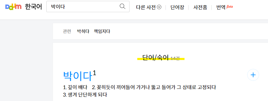 '박다의 피동사이기도 하다. '고려대한국어대사전'과 '우리말샘'의 설명도 추가적으로 붙이겠다.