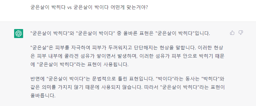 ChatGPT에 물어보았을때 ChatCPT는 '박히다'가 맞다고 설명해 주었다. 아직 한글 맞춤법에는 정확도가 다소 떨어지는 모습을 보인다.