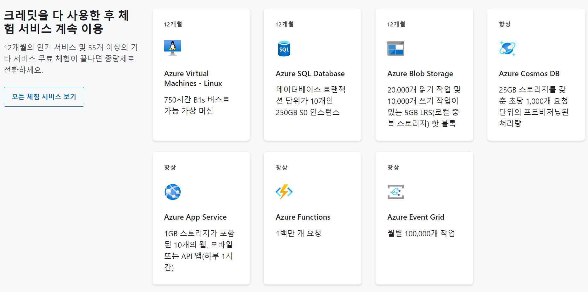 12개월 체험 서비스, 항상 무료인 40개 이상의 서비스 및 200 USD 크레딧으로 시작하세요. Microsoft Azure에서 지금 체험 계정을 만들어 보세요.