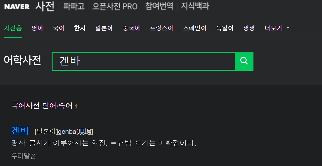 現場는 문자 그대로 의미하는 뜻은 (사건·사고 등의)현장, (작업의) 현장의 의미로 쓰인다. 발음으로는 겐바, 겜바 모두 사용되며 아직 한국어 규범 표기로는 미확정이다. 본문 글에서는 '겐바'를 주로 사용하겠다. 겐바는 일본어로 げんば 이며 일본어에서 온 단어이며 영어로는 gemba 라고 표기한다.