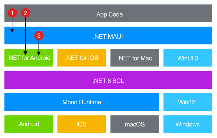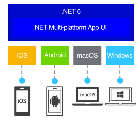 .NET MAUI 가 중간에서 단일 코드 베이스를 기반으로 각각의 플랫폼 별로 API를 맞추어 실행된다. 간단하게 생각하면 .NET MAUI 가 인터페이스 역할을 하고 있다고 보면 됩니다.