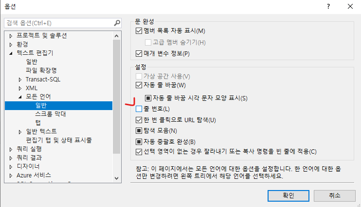 위치 : 도구 > 옵션 > 텍스트편집기 > 모든 언어 > 일반