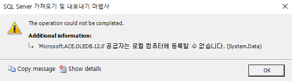 SSMS 에서 데이터 내보내기 or 가져오기 할 때 '공급자는 로컬 컴퓨터에 등록할 수 없습니다.' 같은 오류가 발생할 때가 있는데 해당 경우는 엑셀 버전이 다른 경우 발생한다. 본인은 SSMS 데이터 엑셀로 내보내기 할 때 발생했다.
