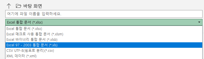 위 이미지처럼 대상 선택시 'Excel 파일 경로' 를 선택하는 부분에서 'Excel 버전' 과 같은 버전으로 엑셀을 만들어 주면 된다. 엑셀 저장시 '파일 > 다른 이름으로 저장' Excel 버전과 동일하게 맞추어 주면 된다.