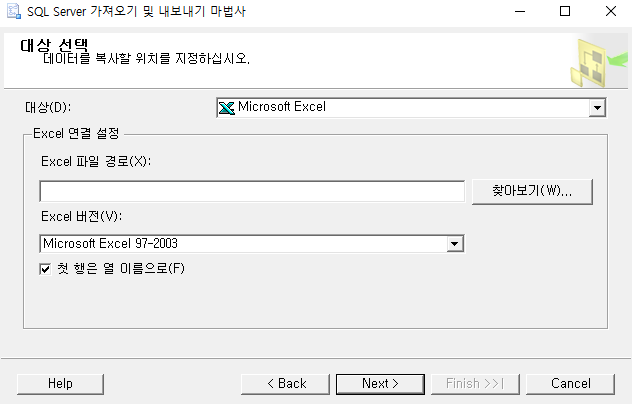 위 이미지처럼 대상 선택시 'Excel 파일 경로' 를 선택하는 부분에서 'Excel 버전' 과 같은 버전으로 엑셀을 만들어 주면 된다. 엑셀 저장시 '파일 > 다른 이름으로 저장' Excel 버전과 동일하게 맞추어 주면 된다.