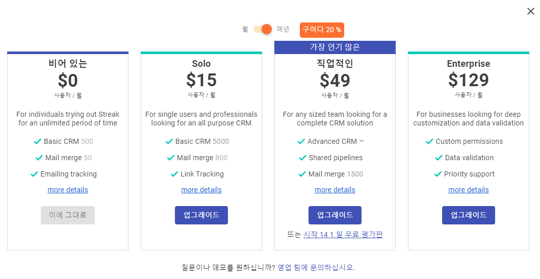 기본적으로 Streak 무료 버전이 있으며 일반적으로는 무료버전으로도 충분히 사용 가능하다. 추가적인 기능들이 필요시 업그레이드를 통하여 사용 가능하다.