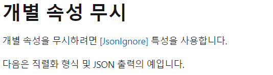 이미지 기준 직렬화 제외할 속성에 [JsonIgnore] 사용하면 제외된다. 해당 이미지의 코드를 아래 같이 표기해두겠다.
