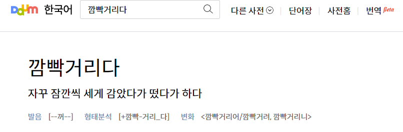 - 눈이 자꾸 감겼다 뜨였다 하다. 또는 그렇게 되게 하다. ‘깜박거리다’보다 센 느낌을 준다.