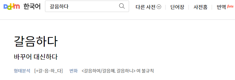 '갈음하다'는 무엇인가 바꾸어 대신한다는 의미다. 쉽게 말해 '대신한다'라는 의미와 동일한 의미를 가지고 있다. '갈음하다'의 유의어로는 '대신하다', '대체하다'. '바꾸다' 와 같은 단어가 있다. '갈음'의 뜻이 다른 것으로 바꾸어 대신함 이라는 뜻을 갖고 있다. 예를 들어, '과거에는 사람들이 음식으로 화폐를 갈음하여 사용하기도 했다.' 같은 상황에 사용가능하다.