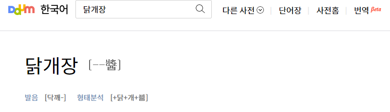'닭개장'이란 다른 고기 대신에 닭고기를 넣어 육개장처럼 끓인 음식을 이르는 말로 '닭'과 '개장'이 결합하여 생긴 단어이다.